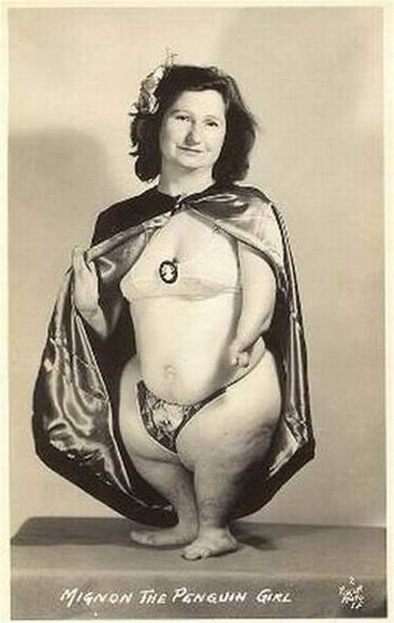 Ruth Berry, born around 1910, was a prominent attraction from 1930-1965. She was born with phocomelia in all four limbs and her fingers were fused, giving her the appearance of having flippers. She was known professionally as "Mignon" which means "cute" in French. Circa 1930s.