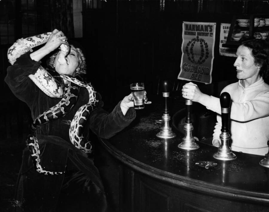 Circus performer Millie Kayes swallowing the head of a 12-foot python in the bar of the Peggy Bradford hotel. 1952.