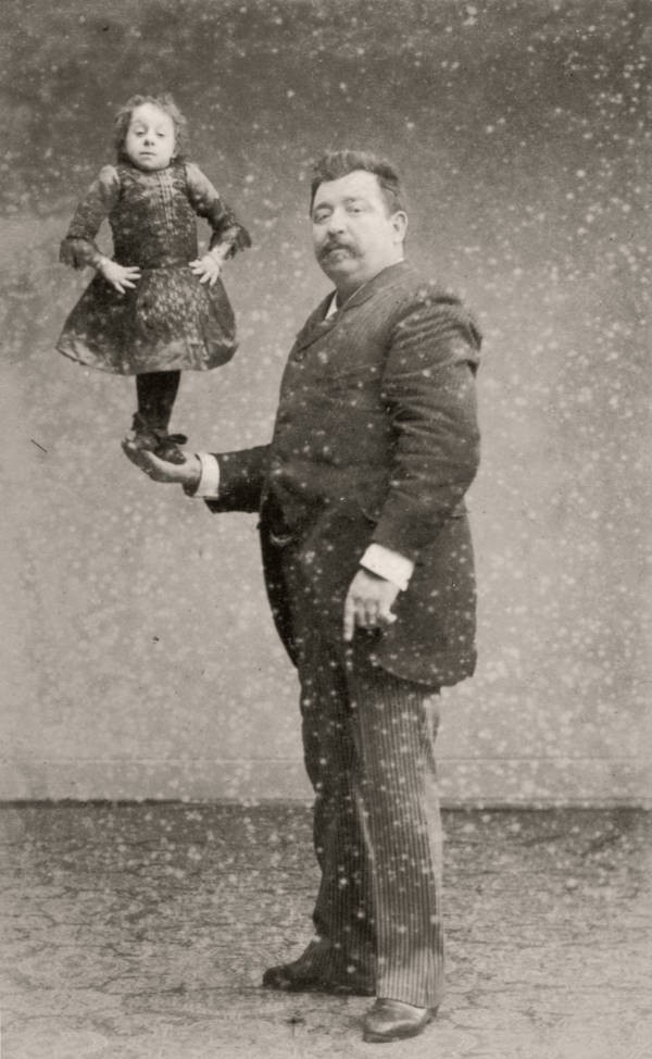 Dutch midget Johanna Pauline Musters, a.k.a. "Princess Pauline," "Lady Dot" or the "Midget Mite," standing on the hand of her manager Verschueren. Circa 1890. She weighed eight and a half pounds and measured 17 inches in height.