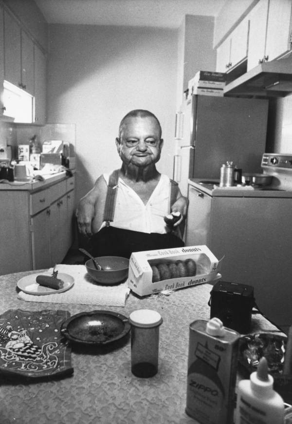 "Sealo the Sealman," a retired sideshow performer, enjoying a donut for breakfast. 1960.
