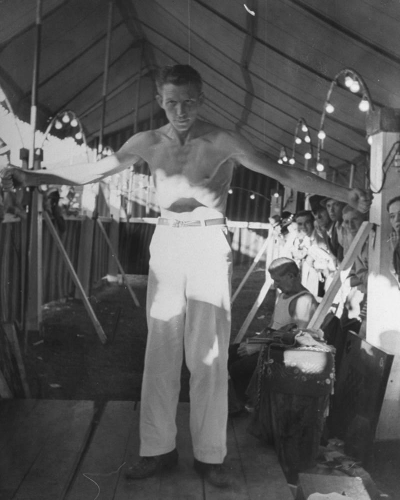 Silas Whaley, the man without a stomach, pulling his stomach in so far it seems like he doesn't have one as he awes onlookers in carnival sideshow at the Greenbrier Valley Fair. 1938.