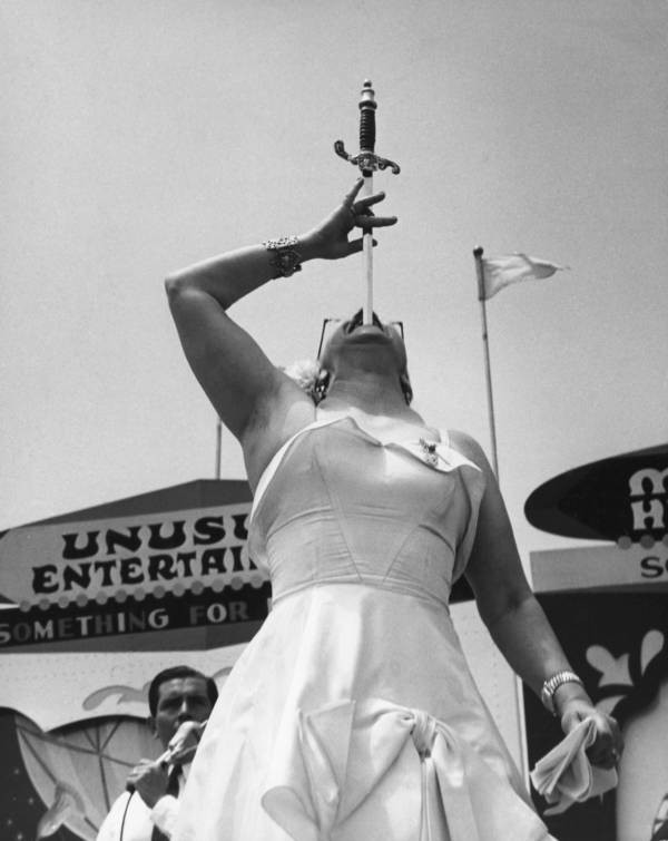 A circus woman performs a sword swallowing trick. Date unspecified.