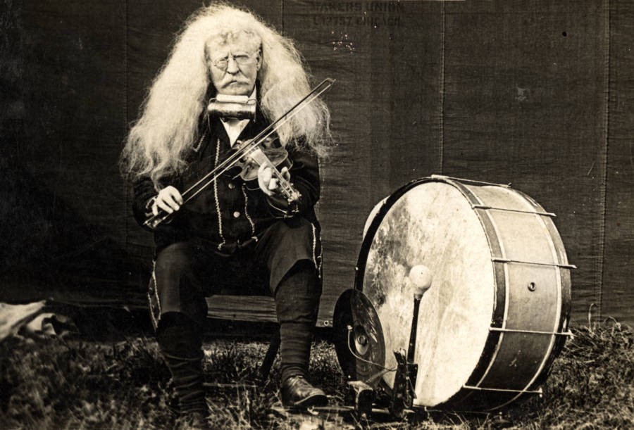 Elderly American musician "Professor" W.H. McMillan, a one-man band, sits with his bow and fiddle at the ready next to his drum and cymbal kit in front of a circus tent in Oakwood, Texas. 1910s.