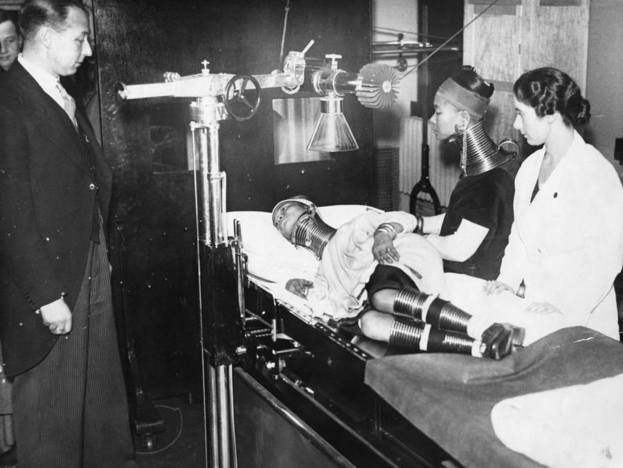 Members of Bertram Mills' "freak" show are examined by doctors. On the examination table is the "Giraffe Necked Woman." 1935.