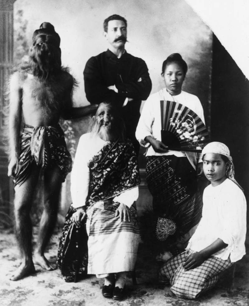A Burmese family, two of whose members have faces covered in hair, are just one of the attractions advertised by American showman and circus owner P.T. Barnum. 1890